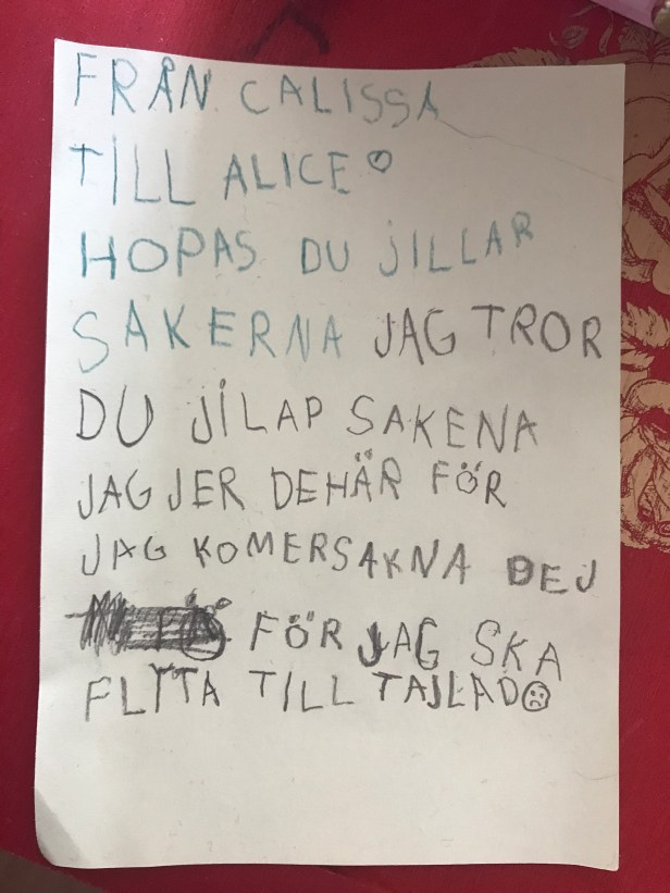 En har varit orolig för tsunamis och känner att det är tryggare här i Sverige. Vi har pratat, hon har skrivit brev, ritat teckningar och bearbetat. Det har varit teckningar med två barn på och där det ena barnet gråter och den andra har en jättevåg över sig ”som hon inte hinner se”. Vi har talat om positiva saker och fokuserat på dem men även pratat om rädslorna.