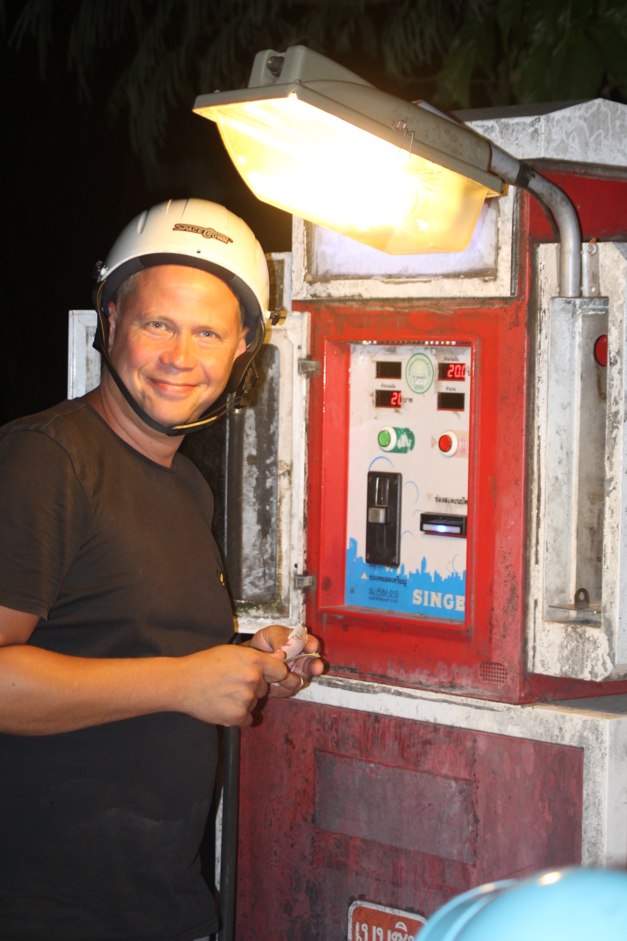 Nattankning av mopeder. En lite äldre modell av tankomat… Hahaha… men oftast köper man enlitersflaskor, typ gamla vodkaflaskor och fyller på mopeden med.