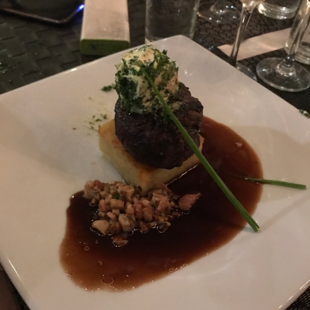Den välkomponerade trerätters menyn bestod av en förrätt med hembakat solrosknäcke, räkcocktail och någon härlig mousse till. Varmrätten var en perfekt stekt oxfilé med potatiskaka, portvinssås och smör med västerbottenost i! Så fantastiskt galet gott, tyckte stora och små.
