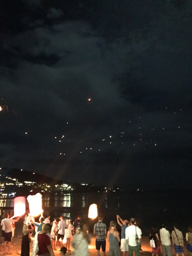 Mellan rätterna lekte barnen på stranden, gosade med den helvita lilla katten och köpte lyktor åt oss som vi senare släppte upp i skyn tillsammans med våra önskningar. Att promenera längs den mörka stranden med tusentals andra (leende!) människor, lyktor över hela himmelen och nyårsaftons barnsliga förväntningar i kroppen… det är finfint det!
