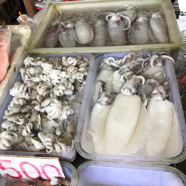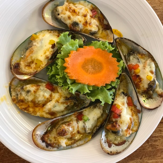 Vi valde stora räkor som grillades, en red snapper (stor rosa fisk) som stektes med vitlök och peppar, musslor som gratinerades med ost och paprika samt bläckfisk som friterades. Till det tog vi kokt ris och dryck.