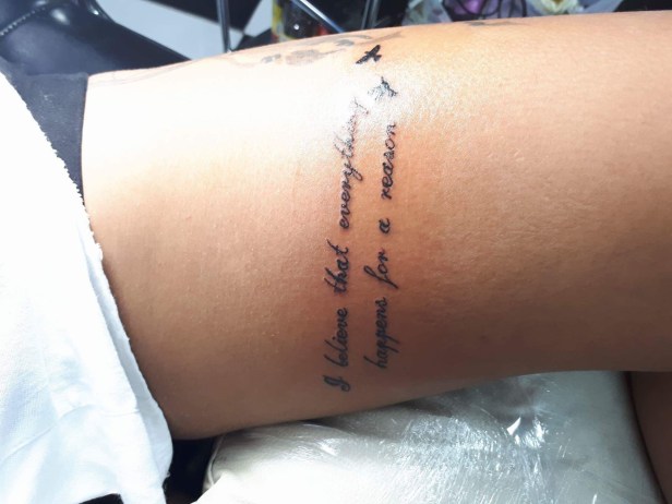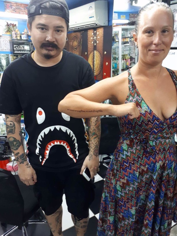 – Den på thai betyder ”If there is a Will there is a way”, ett uttryck min pappa alltid sagt till mig. Allting går bara man vill… så den är för att hedra honom. Den andra tyckte jag bara texten var talande.