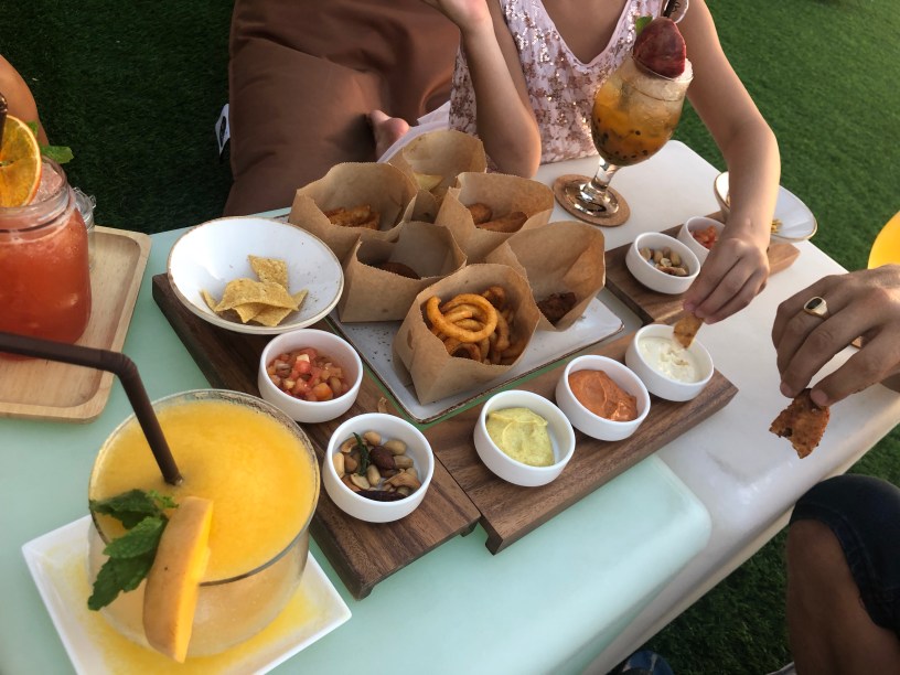 Vi började med att beställa in en trevlig snacksbricka (runt 500 baht) som innehöll, nachos, friterade lökringar, mozzarellasticks och potatisklyftor, dippsåser med mera.