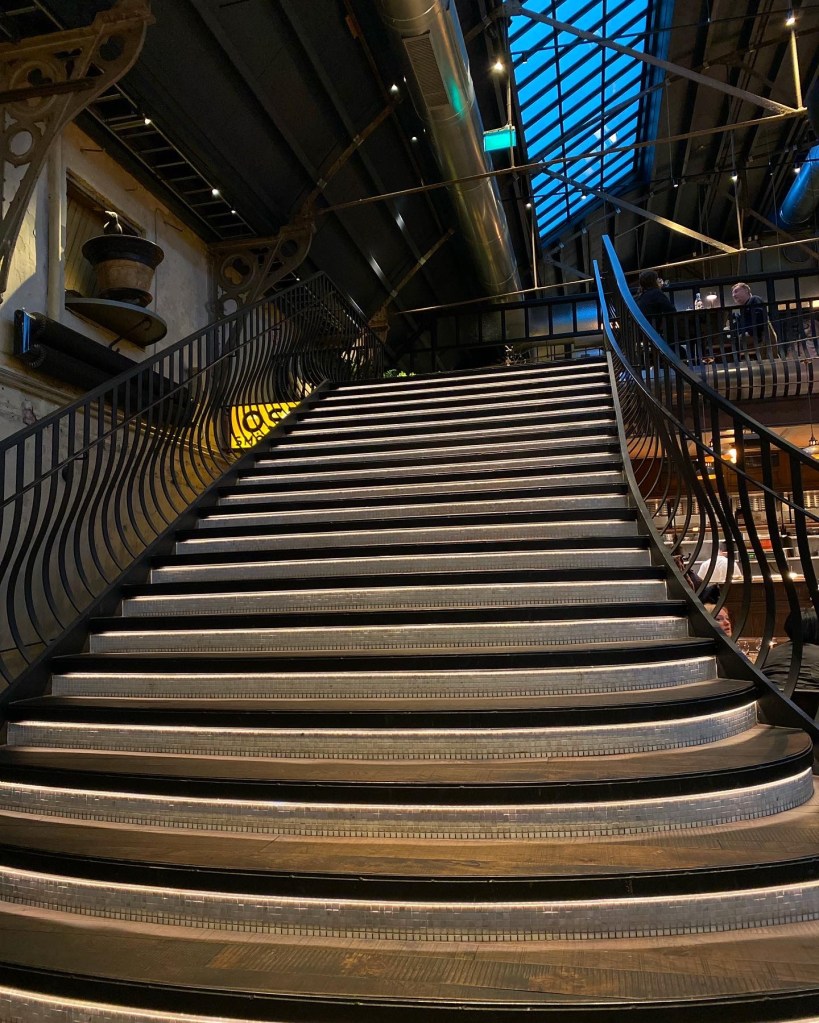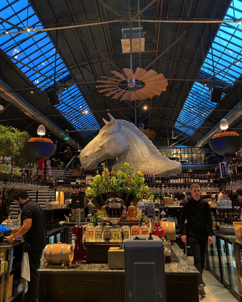 Glastaket har stora fläktar, lokalen är prydd med granit, marmor och statyer från Florence. Den stora baren, den magnifika trappan och det enorma hästhuvudet är i fokus, men det finns även många andra spännande detaljer att kika på. Vattenstationen sägs vara hämtad ända från en bergsby utanför Bergamo och personalen bjöd på en hel del intressanta historier.