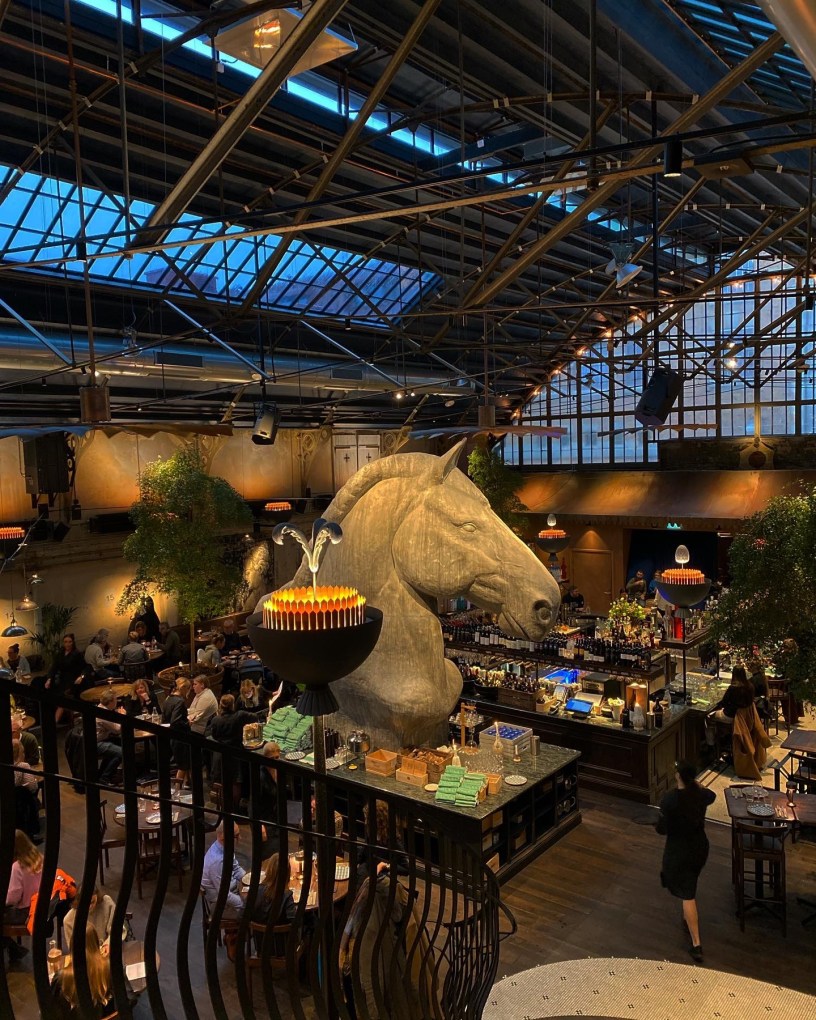 Glastaket har stora fläktar, lokalen är prydd med granit, marmor och statyer från Florence. Den stora baren, den magnifika trappan och det enorma hästhuvudet är i fokus, men det finns även många andra spännande detaljer att kika på. Vattenstationen sägs vara hämtad ända från en bergsby utanför Bergamo och personalen bjöd på en hel del intressanta historier.