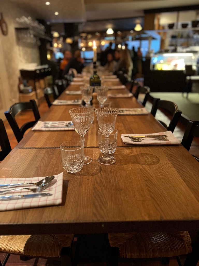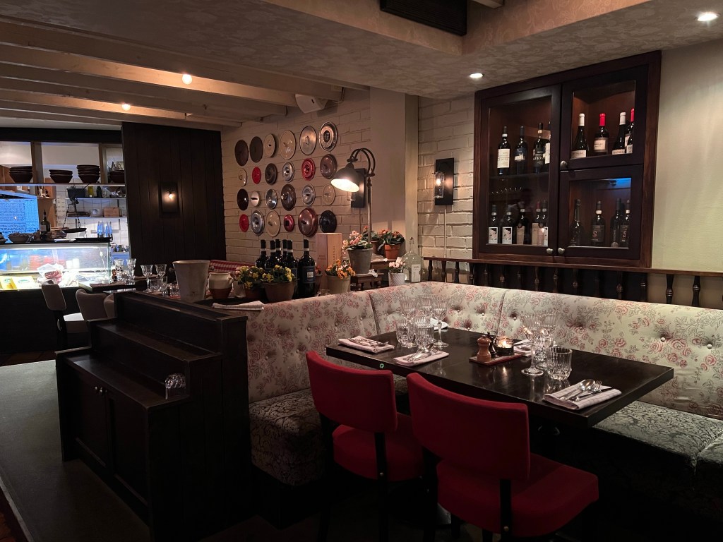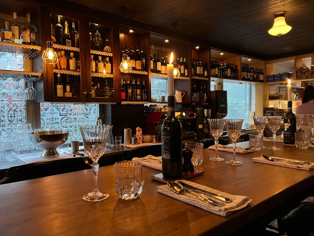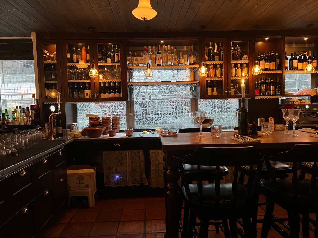 Här träffas unga, gamla och till och med en och annan hund. Nonna känns som ett stort, välkomnande hem med fina glas, tygservetter, böcker och olika sittplatser för små och större sällskap. Svartvita bilder på italienska släktingar och mönstrade tallrikar på väggarna varvas med vita spetsgardiner och moderna lampor. Det är lite mörkt och mysigt med stearinljus på borden och man trivs bara så himla bra här!