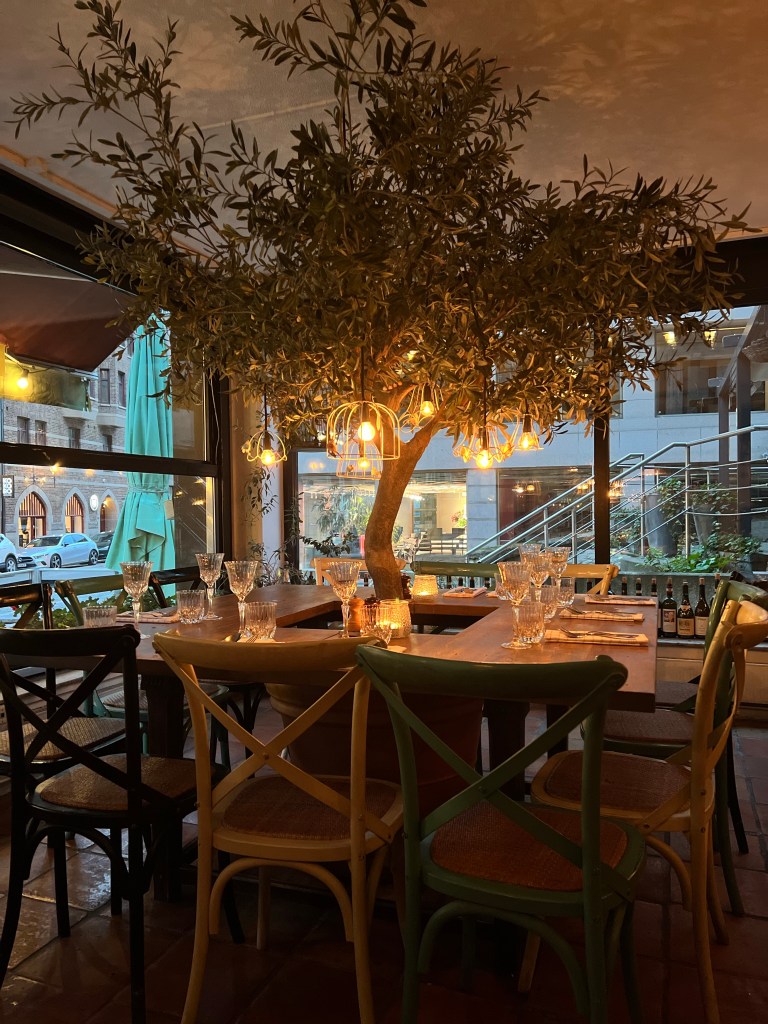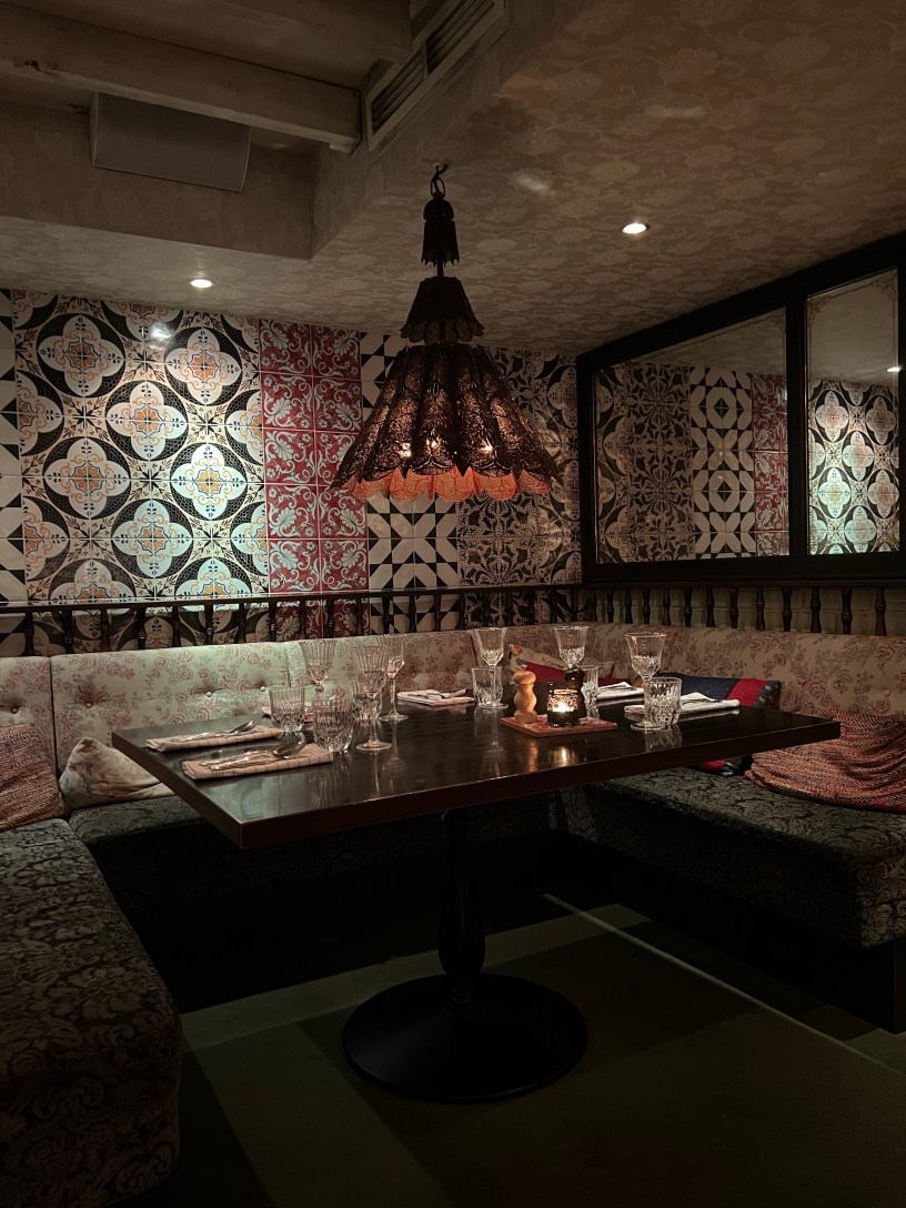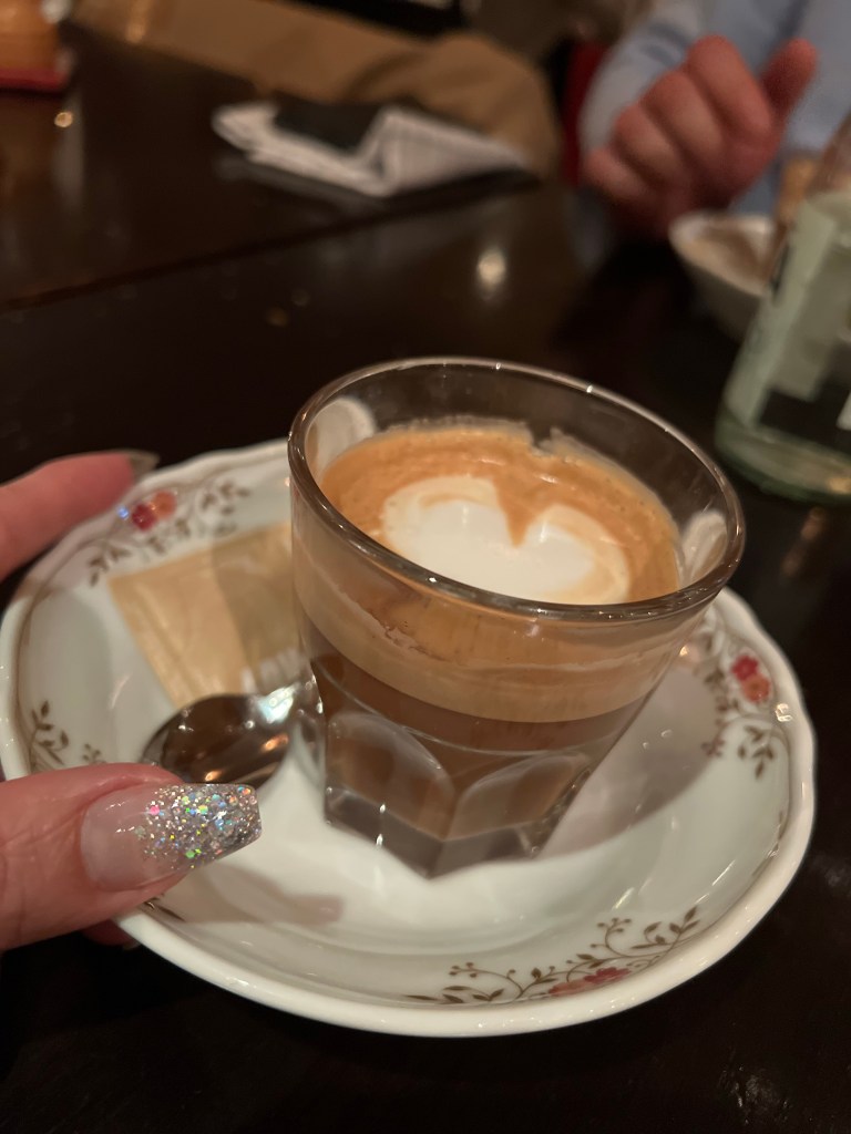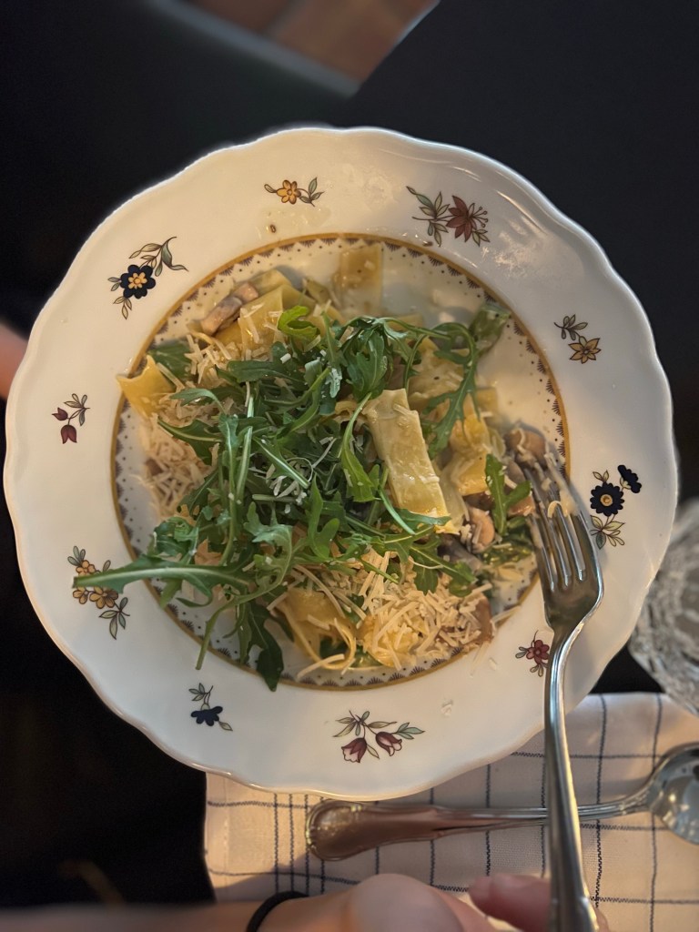 Här träffas unga, gamla och till och med en och annan hund. Nonna känns som ett stort, välkomnande hem med fina glas, tygservetter, böcker och olika sittplatser för små och större sällskap. Svartvita bilder på italienska släktingar och mönstrade tallrikar på väggarna varvas med vita spetsgardiner och moderna lampor. Det är lite mörkt och mysigt med stearinljus på borden och man trivs bara så himla bra här!