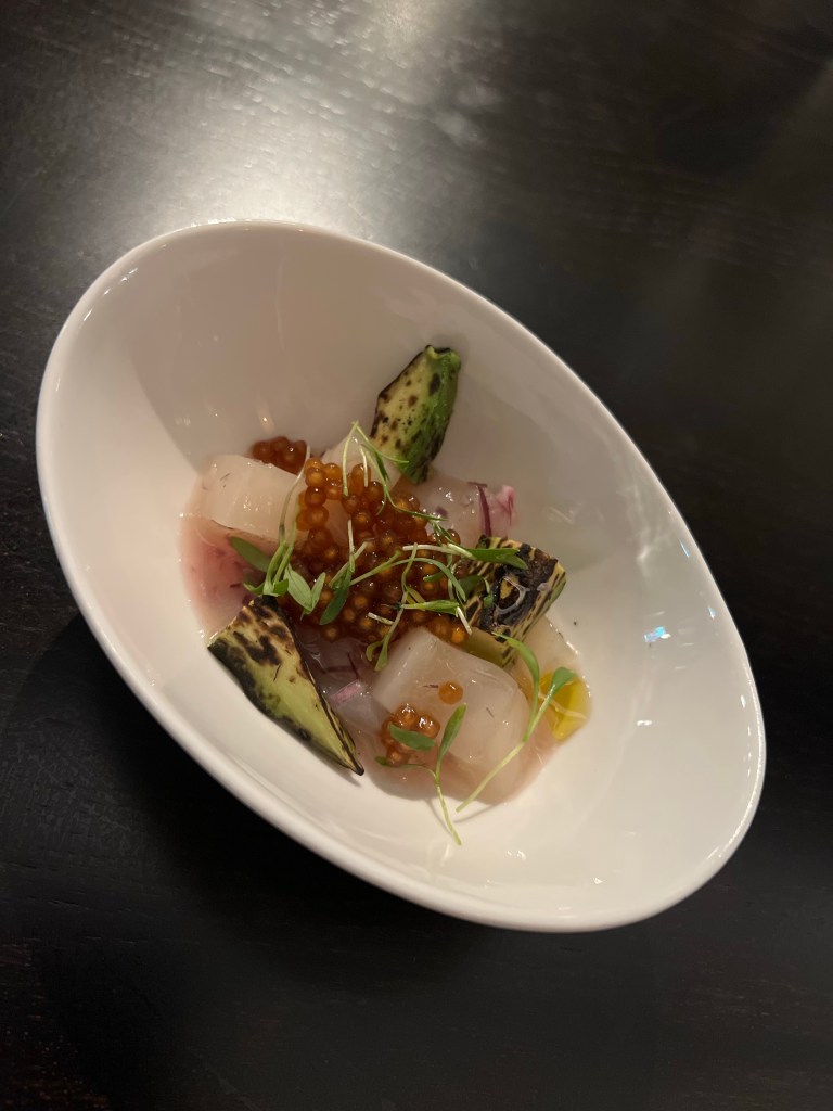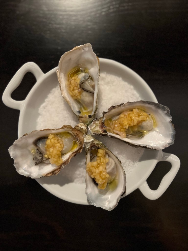 Vi startade med ostron – i en helt ny tappning med mango – och satte ribban på vår kväll. Vi, som först tvekade på att kliva in i restaurangen och var på väg hemåt. Men så kikade vi på menyn och kunde dessutom inte motstå de trevliga människorna som jobbade här. O, vilken upplevelse vi fick!