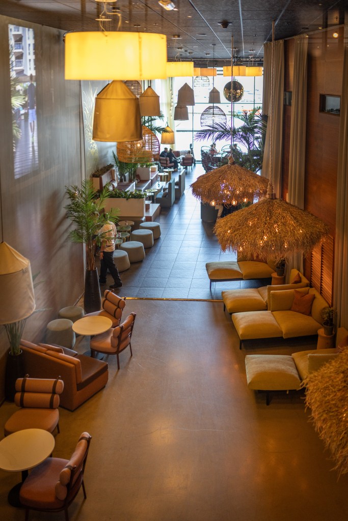 Vi började med en burgare i baren efter att vi passerat den stora välkomnande lobbyn. Från baren har man en vy över den fina matsalen och hamnen utanför.