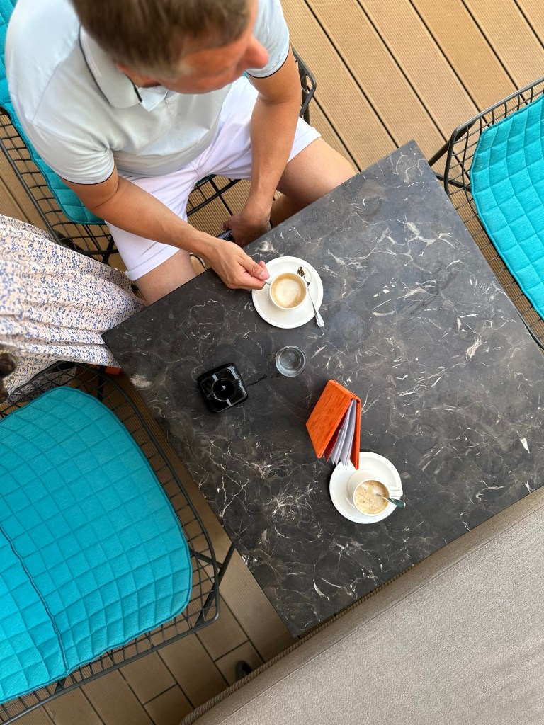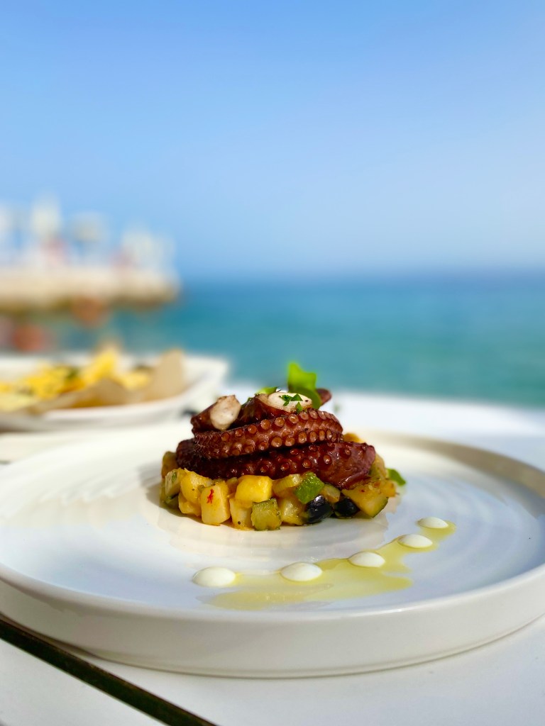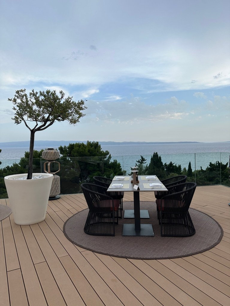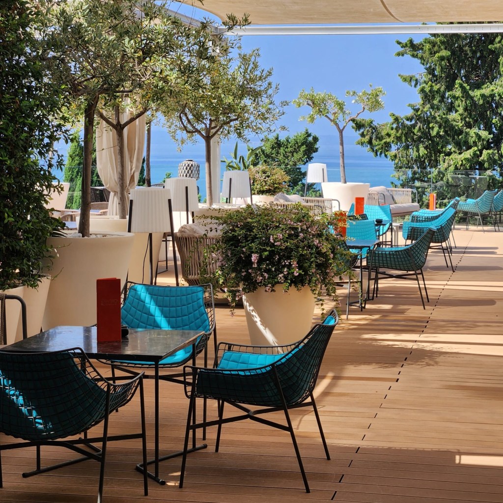 På den stora takterrassen kan man njuta av en magisk vy över havet. Det finns möjlighet att sitta både inne och ute, i skuggan och i solen. Det är även här man avnjuter sin frukost, lunch eller middag.